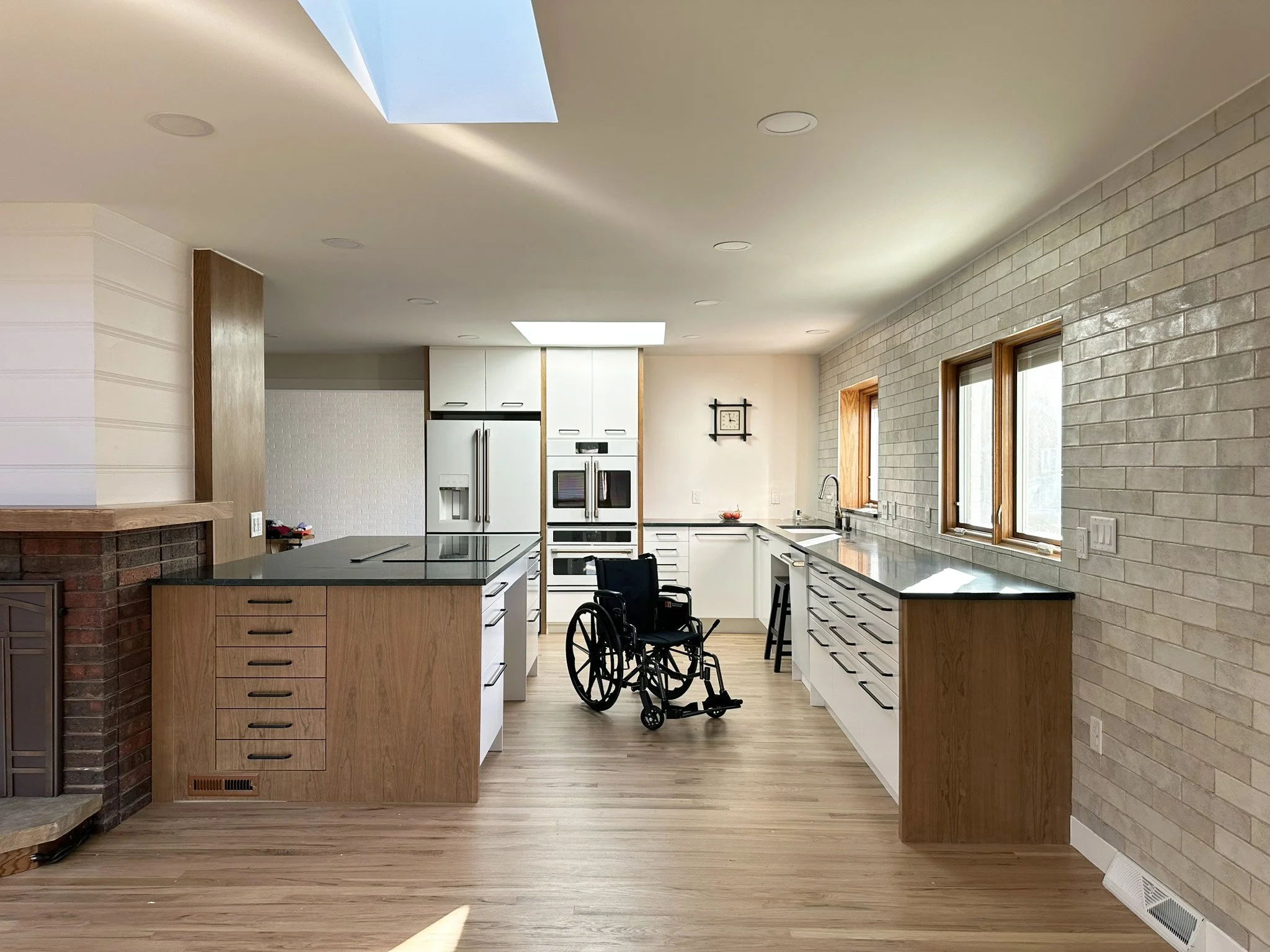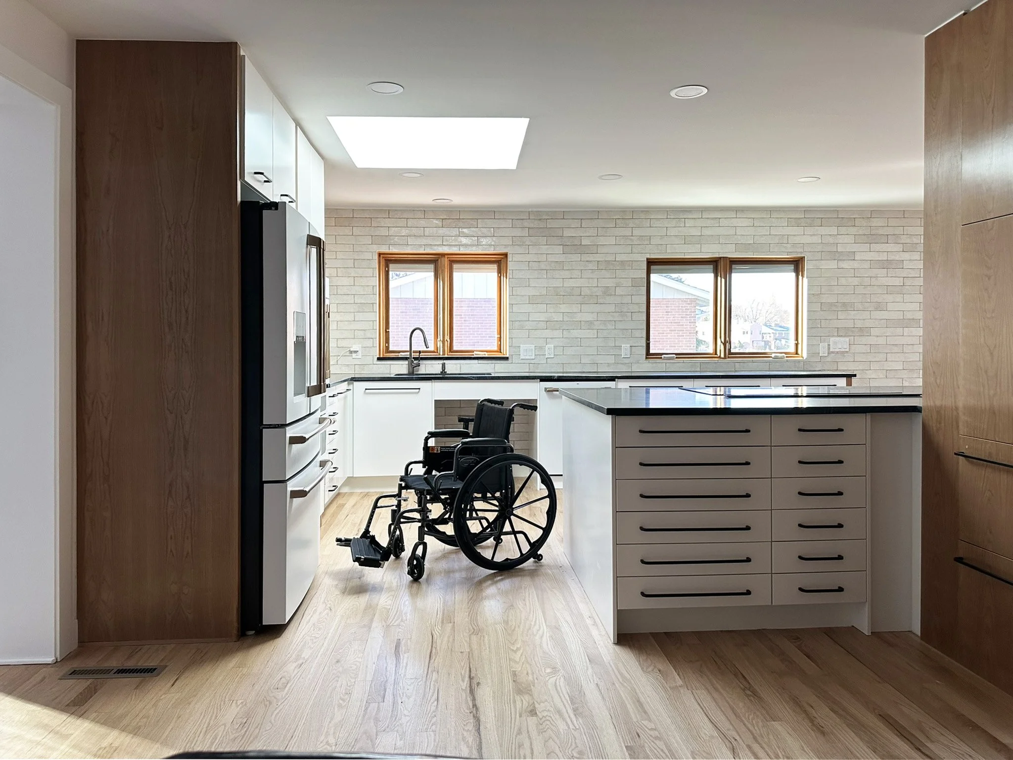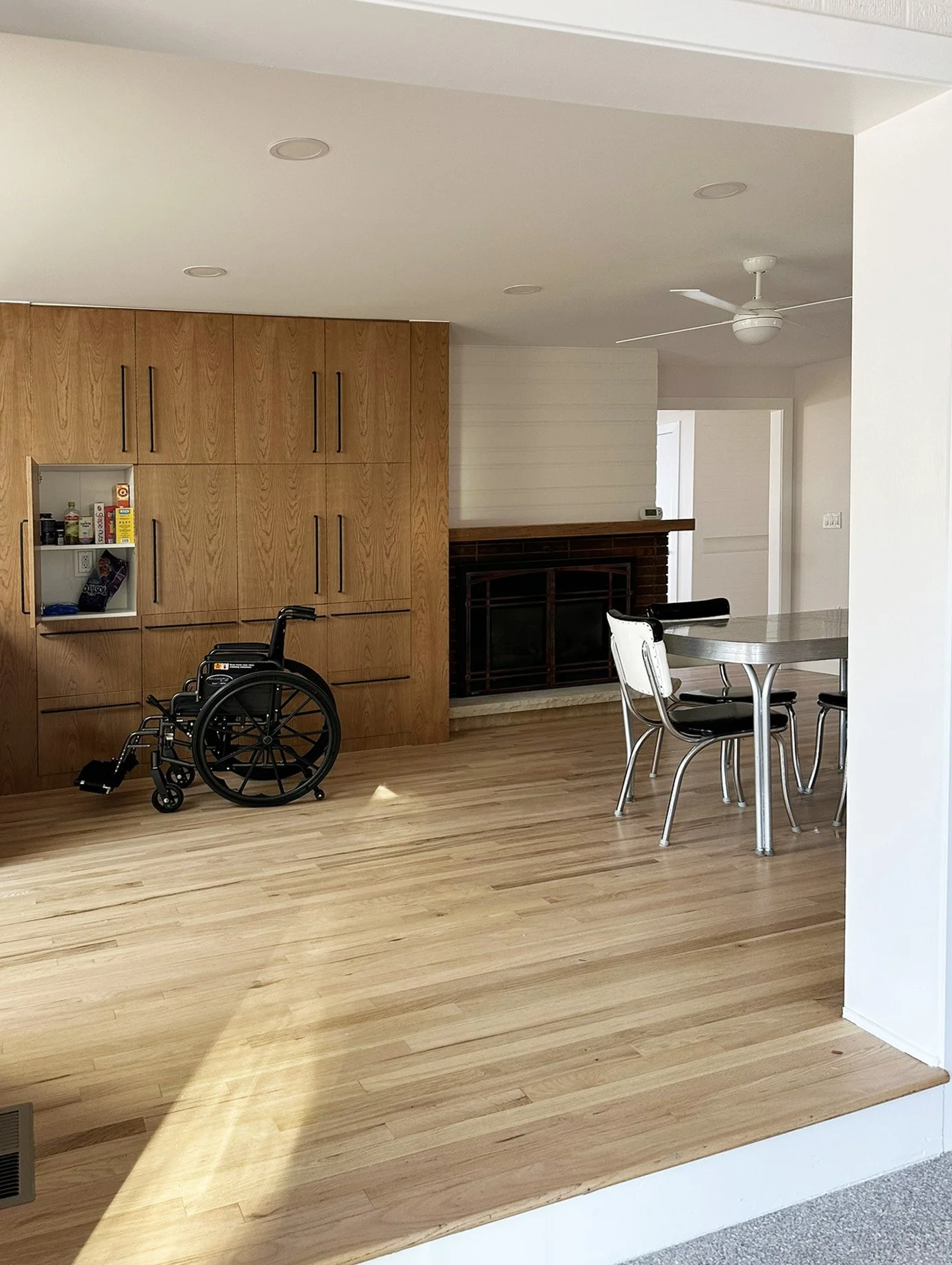 The kitchen: with drawers and roll under sink and cooktop. Plenty of space for wheel chairs. The dining area: with floor to ceiling pantry, a closet for wheel chair storage, and a ramp to the breezeway. The living room: with a view to the reservoir.