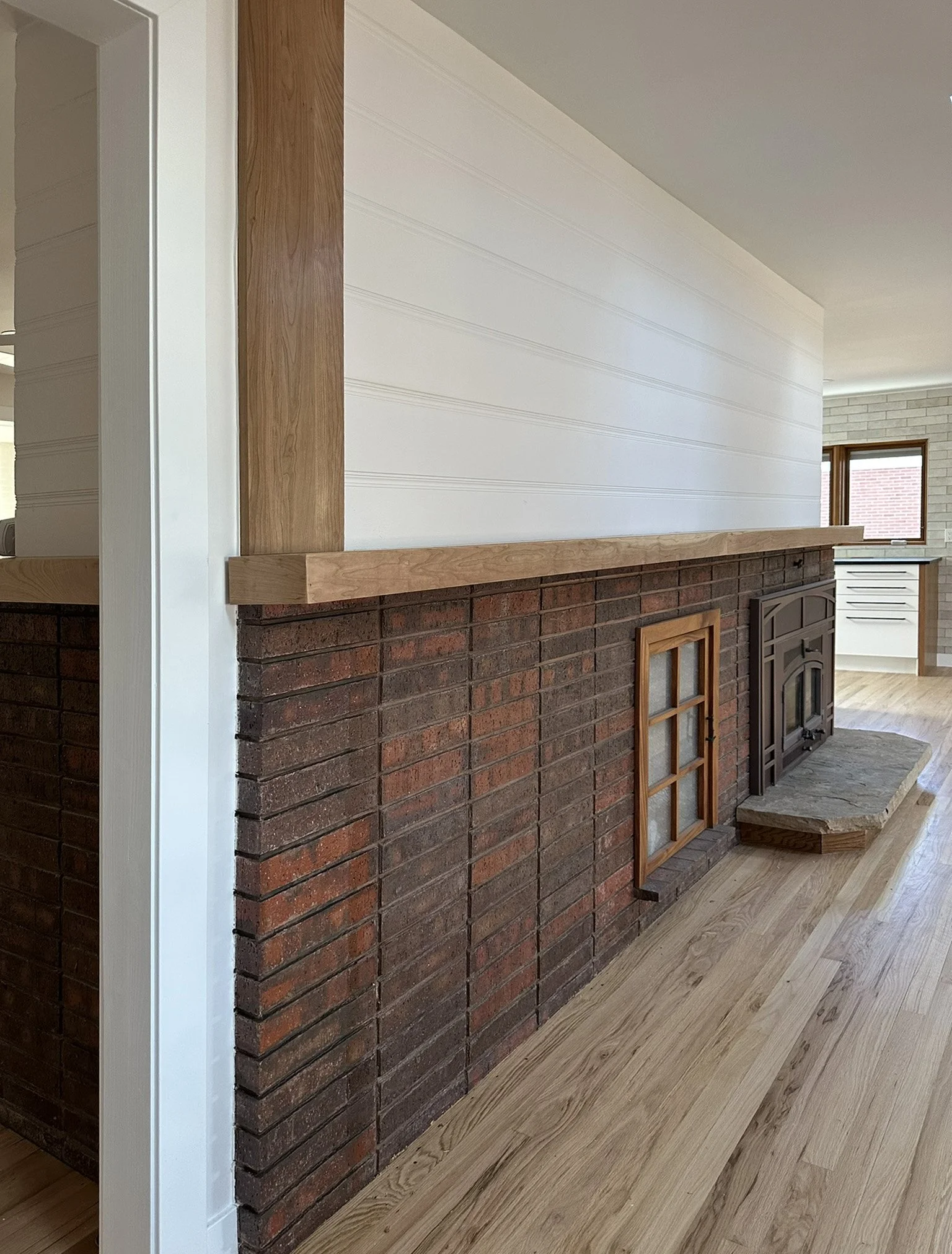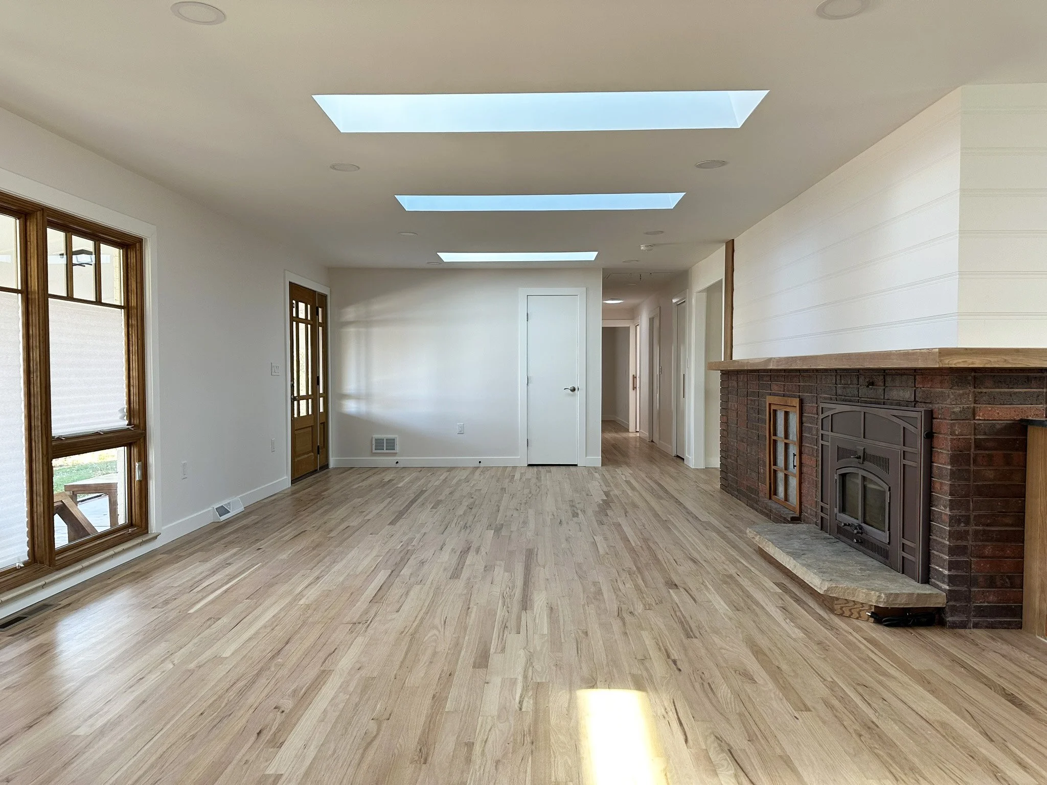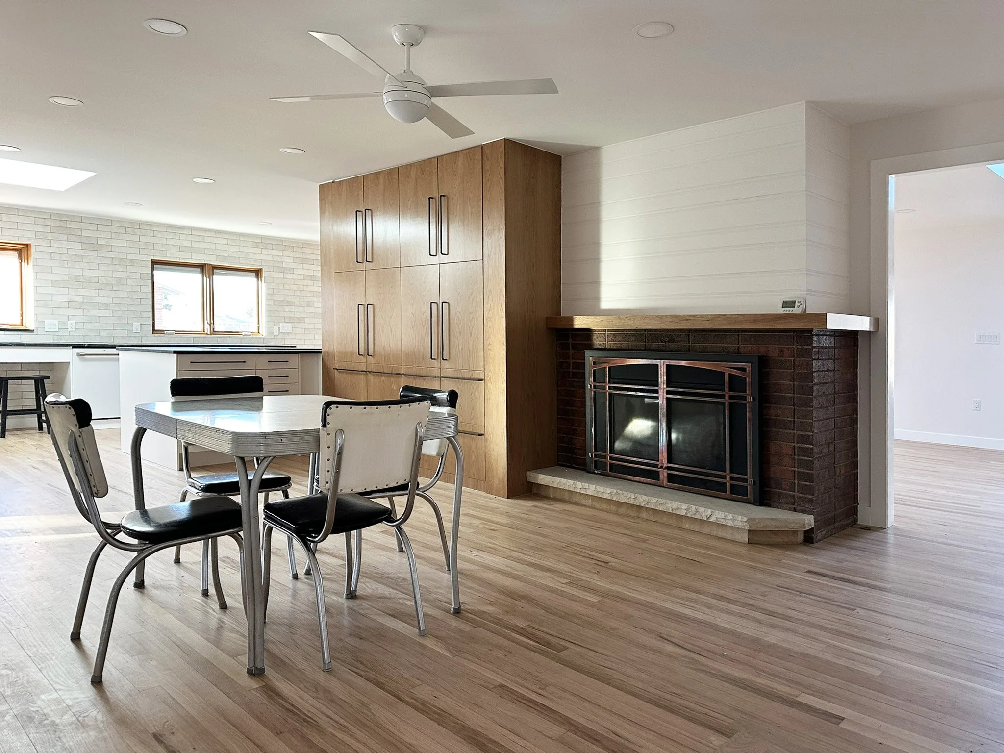 The main living area combines space for dining, living, and cooking. Organized around the hearth.