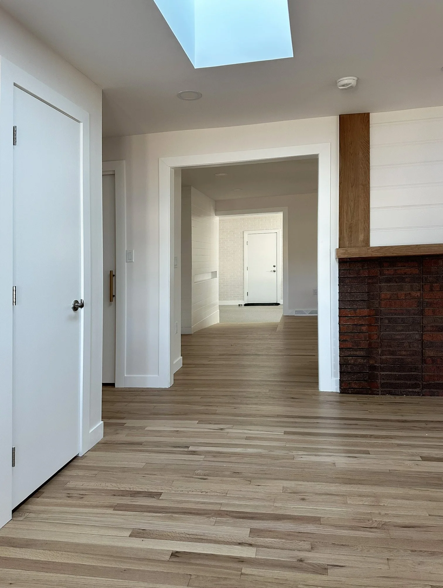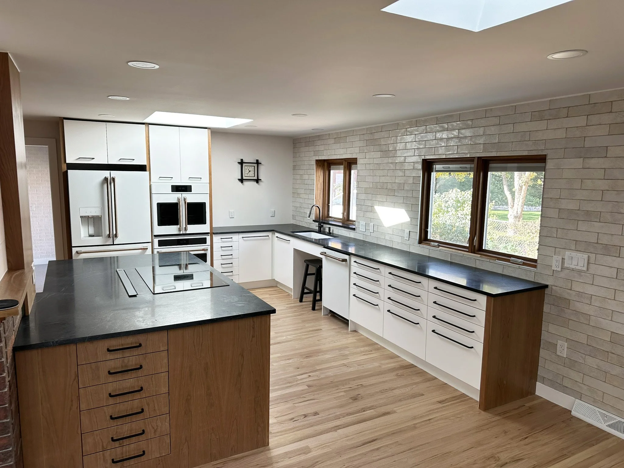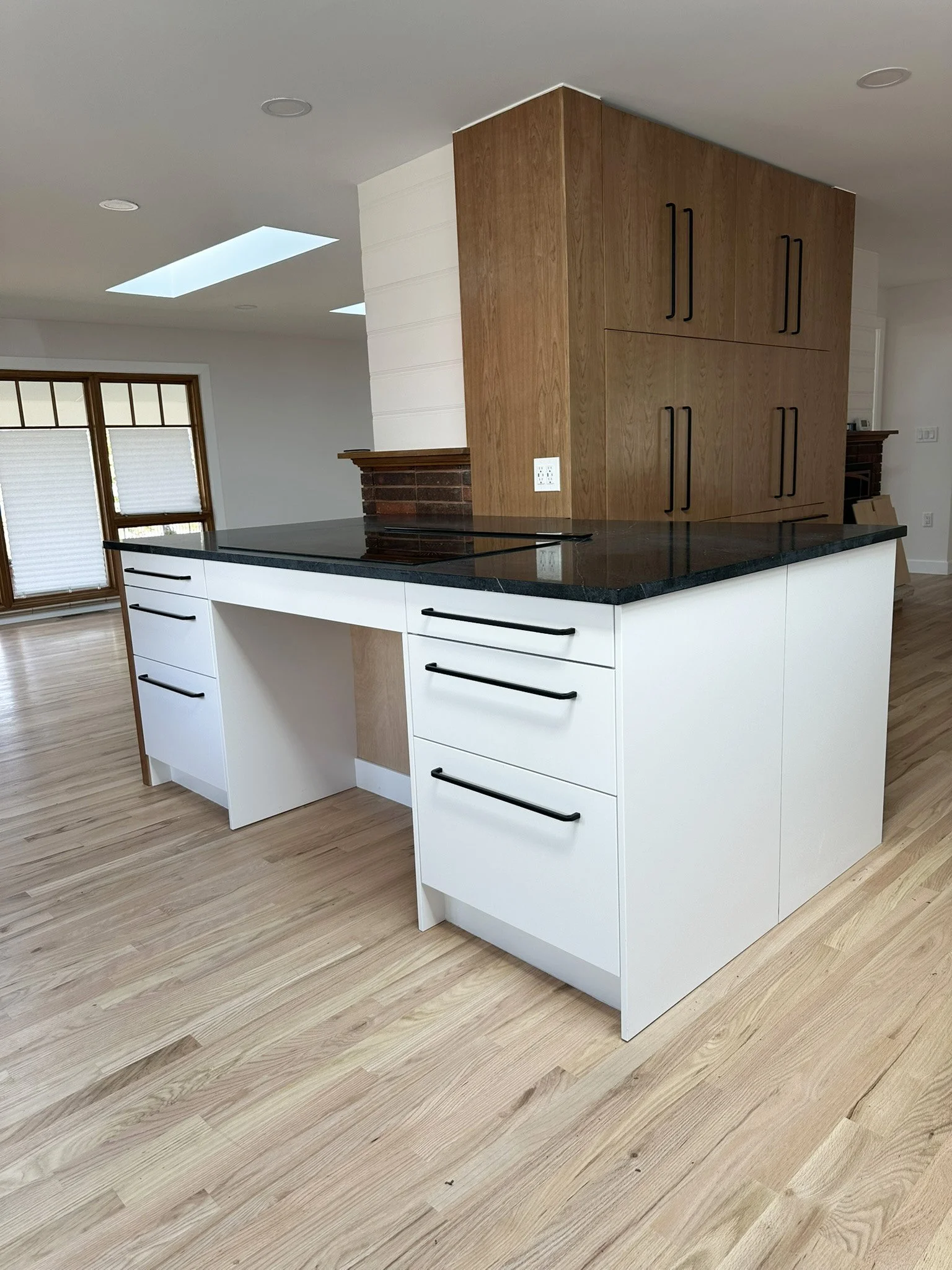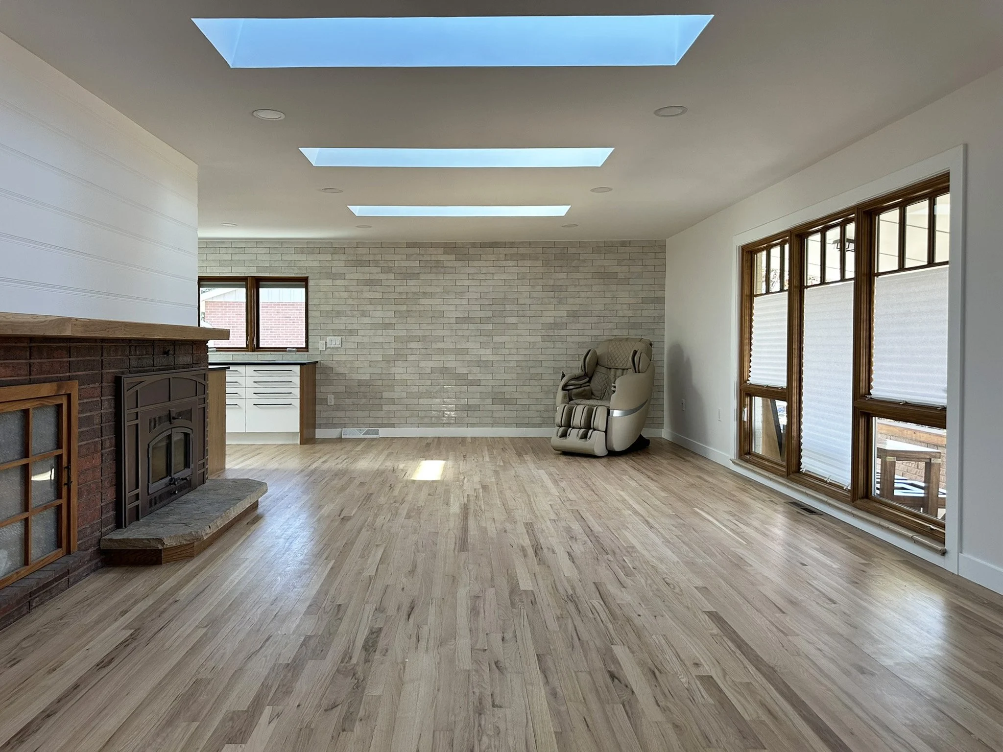 The main living area combines space for dining, living, and cooking. Organized around the hearth.