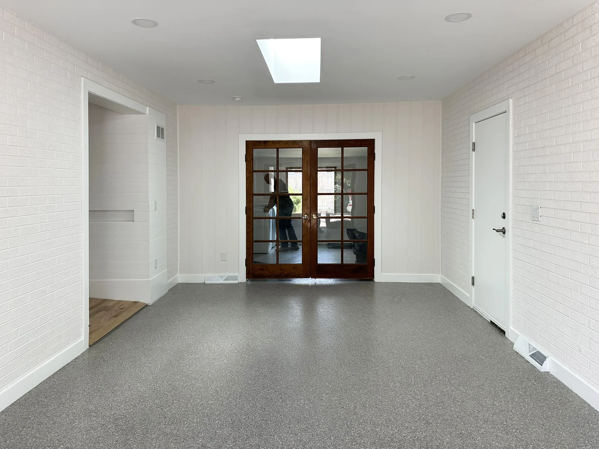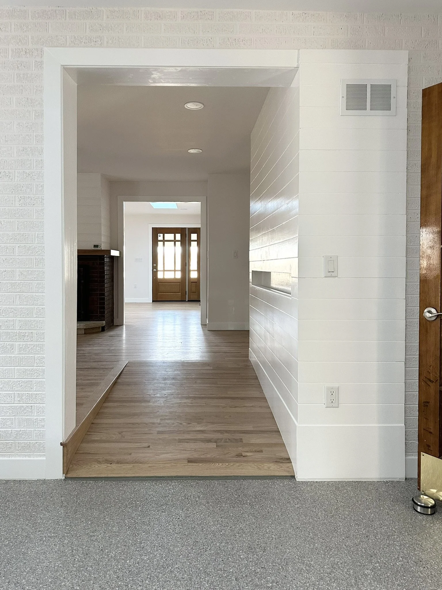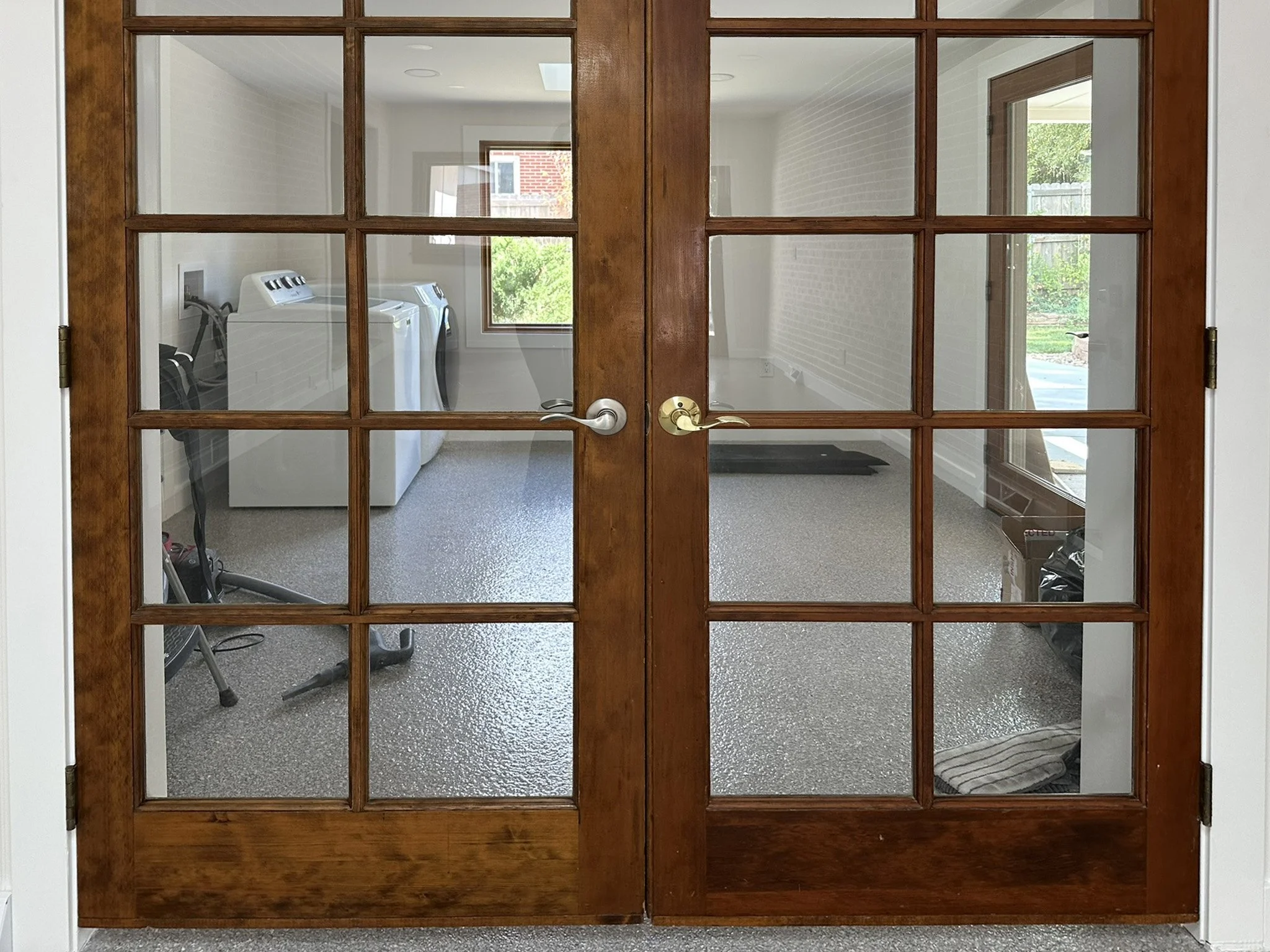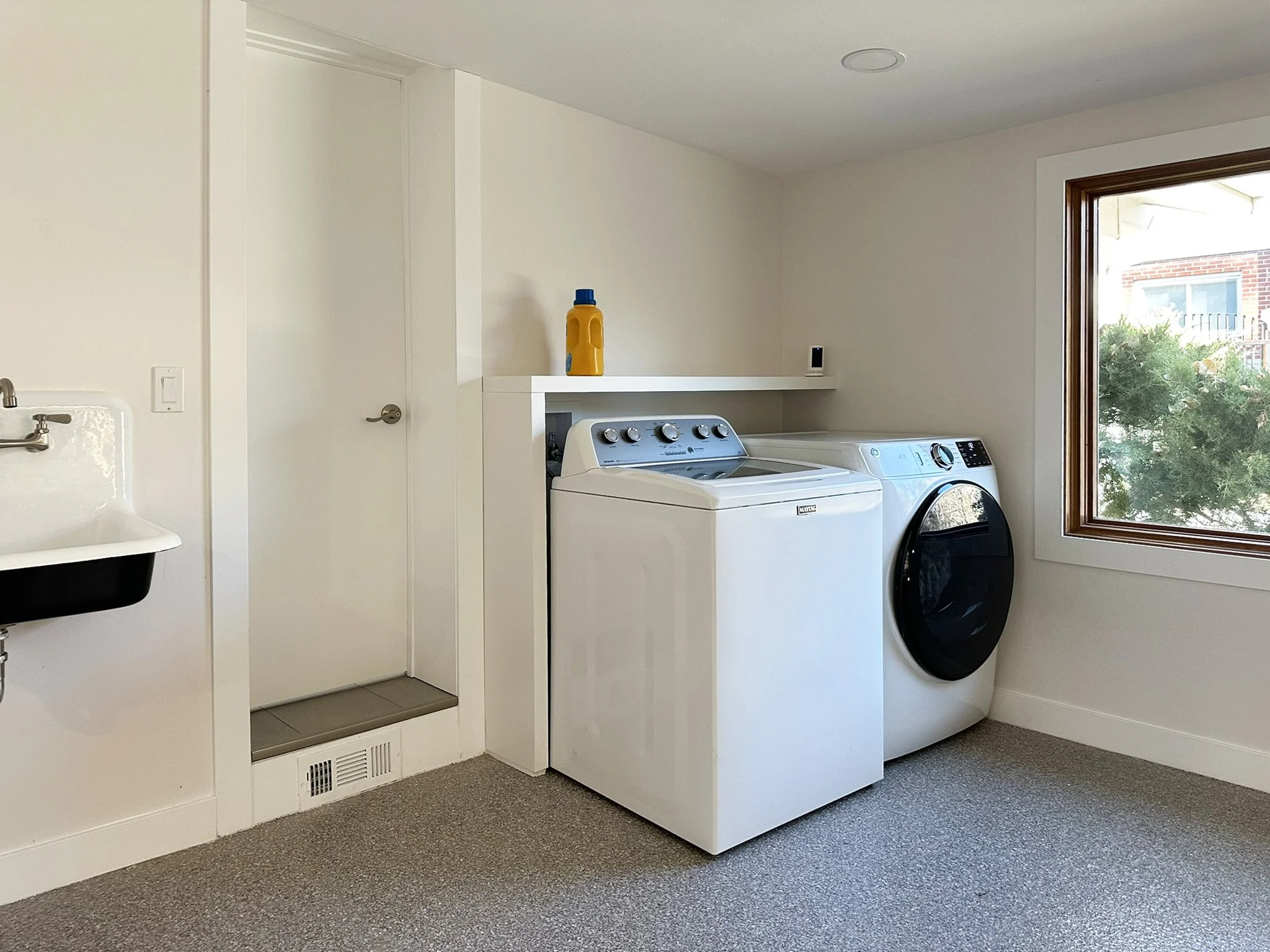 Between the main house and the garage, there is an area we call the breezeway. Although, there is nothing breezy about it. This is a great place to swap your outdoor gear for indoor gear. The laundry room is located at the far end. A door from the laundry room opens to the backyard.